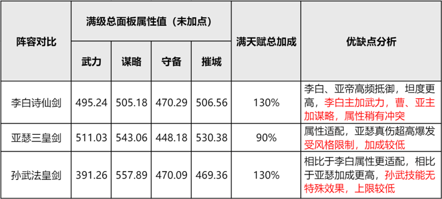 我个人认为,相比于曹操,妇好的技能更契合孙武。孙武需要尽快触发兵圣状态,而触发之后一般是可以自循环的,妇好的技能正好是在战斗前期提供增益;而曹操则是全期增益。所以我觉得法皇剑玩家也可选择把曹操拎出来,去配其他队伍(例如亚瑟+曹操+秦琼,双皇剑),然后孙武、妇好、亚历山大组成一队。