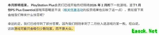 值得一提的是,此前坤哥曾暗示2026年的PS+会免游戏质量会下滑。这次爆料中他也吐槽“这款游戏可能只会吸引少数玩家,而不是大众。”