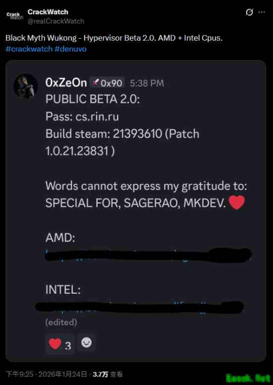 而根据推特账号CrackWatch的消息,0xZe0n目前已发布了《黑神话:悟空》Denuvo加密破解版2.0版本。值得注意的是,他分享的链接中包含了英特尔版本,也就是说该破解版已经支持英特尔处理器了!