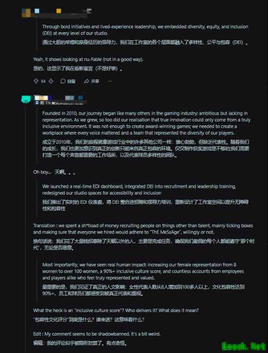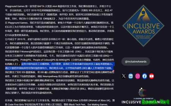 而近期再一次激化矛盾的是,reddit玩家发现工作室在Inclusive Awards(包容性奖项)平台上的资料中,高调宣传其正致力于DEI(多元化、公平与包容)政策,包括DEI纳入招聘和领导力培训,建立包容性的“安全空间”等,并将其融入各个层面。