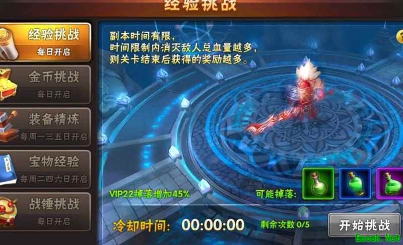 日常挑战包含五种类型:经验、金币和战锤每日开放,装备精炼在每周一、三、五开启,宝物经验则于每周二、四、六开放。