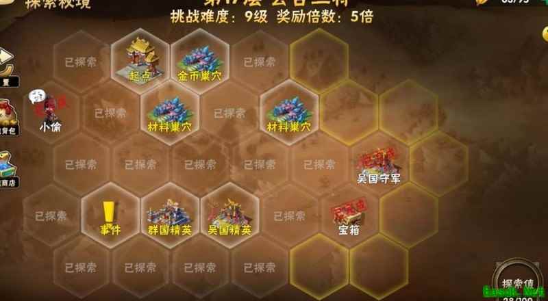 探索地图、参与战斗及领取奖励均需消耗行动点(位于右上角),行动点随时间自动恢复,也可使用元宝补充。每次战斗或领奖可积累探索值(显示于右下角),探索值满后解锁BOSS挑战,成功击败即可进入更高层数,层数越深,奖励越稀有丰厚。