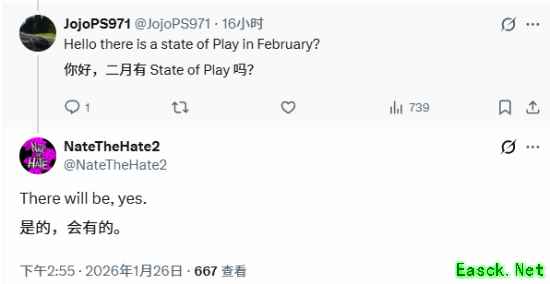 这一消息源于社交媒体上的直接互动。用户 JojoPS971 提问:"你好,2 月会有 State of Play 吗?"NateTheHate 回复:"是的,会有。" 这一确认尤为引人关注,因为这位爆料人本月早些时候还表示自己没有关于 2 月 State of Play 的任何信息。