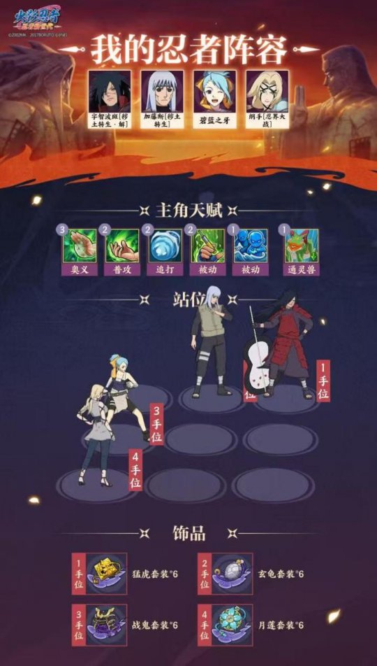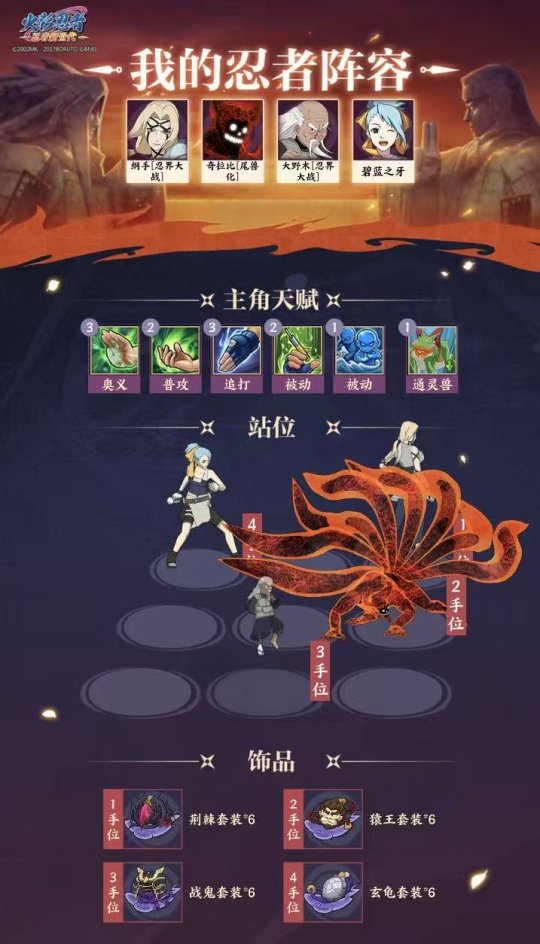 Tip:纲手自身的生存技能,若配合荆棘、月莲、赤晶等饰品,生命恢复能力更强,且其余两个技能效果都能为小队木叶或忍联合军标签忍者提供不俗的辅助。