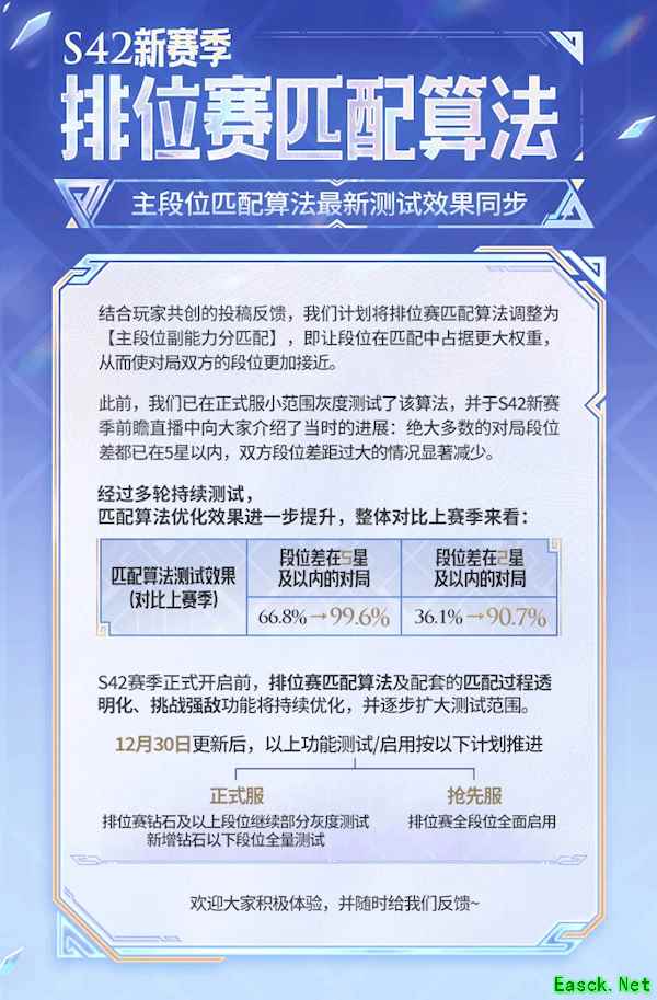 在最新上线的S42赛季中,排位赛匹配机制迎来优化,主打“主段位副能力分匹配”的新算法,已完成多轮测试并将在钻石以下段位全面启用。