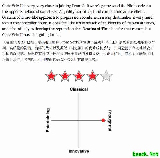 “《噬血代码2》已经非常、非常接近跻身 FromSoftware 作品与《仁王》系列所在的类魂游戏第一梯队。高质量的叙事、流畅的战斗手感,以及类似《时之笛》的优秀成长推进方式相互结合,让人几乎放不下手柄。当然,游戏在某些时候仍显得在寻找属于自己的独特定位,也因此不太可能获得《时之笛》那样的历史级口碑,但《噬血代码2》本身依然有着大量值得肯定的优点。”