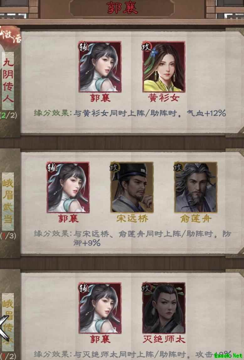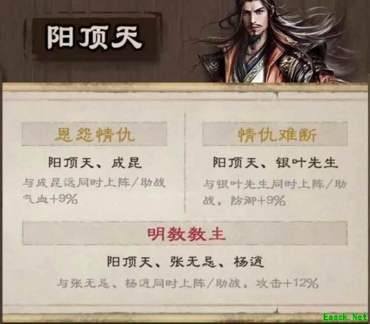 杨逍、阳顶天、郭襄、百损道人、何足道及主角,后期可依情节发展将杨逍或阳顶天替换为觉远,视具体情况而定。