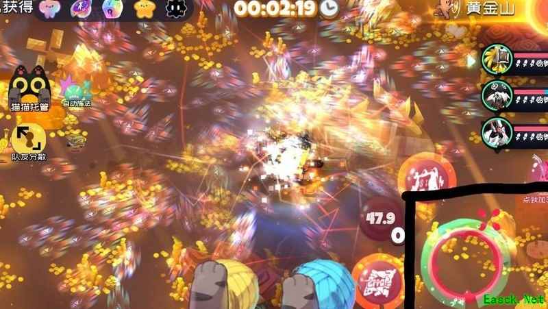 此时取消自动模式,滑动并按住攻击轮盘,另一只手开启自动模式,可让两名队友在无怪物时也持续输出。由于彩虹武器的子弹具备弹射效果,提前释放不会造成浪费。