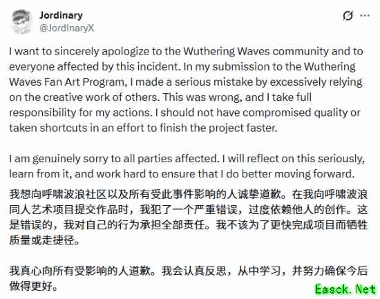 在这份公开声明中,Jordinary 明确向《鸣潮》社区及所有受此次事件影响的人员致歉,称其在提交《鸣潮》同人艺术计划的作品时,因过度依赖他人的创意内容犯下严重错误,认可该行为的不当性,并表示对自身行为负全部责任。同时他提及,此次错误的根源是为了加快项目完成进度,选择牺牲内容质量、走创作捷径,对此进行了反思,并承诺会吸取教训,后续将更严谨地开展创作。