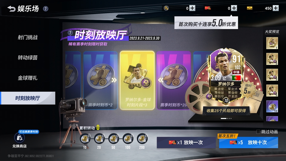 时刻放映厅首期开放时间为9月21日-9月30日,玩家每次进行放映都有概率获得珍稀赛季时刻或赛季时刻片段以及赛季时刻币。累计赛季时刻币,可前往兑换商店兑换赛季时刻奖励。本期大奖为「罗纳尔多-金球时刻」赛季时刻,重磅奖励等您领走!