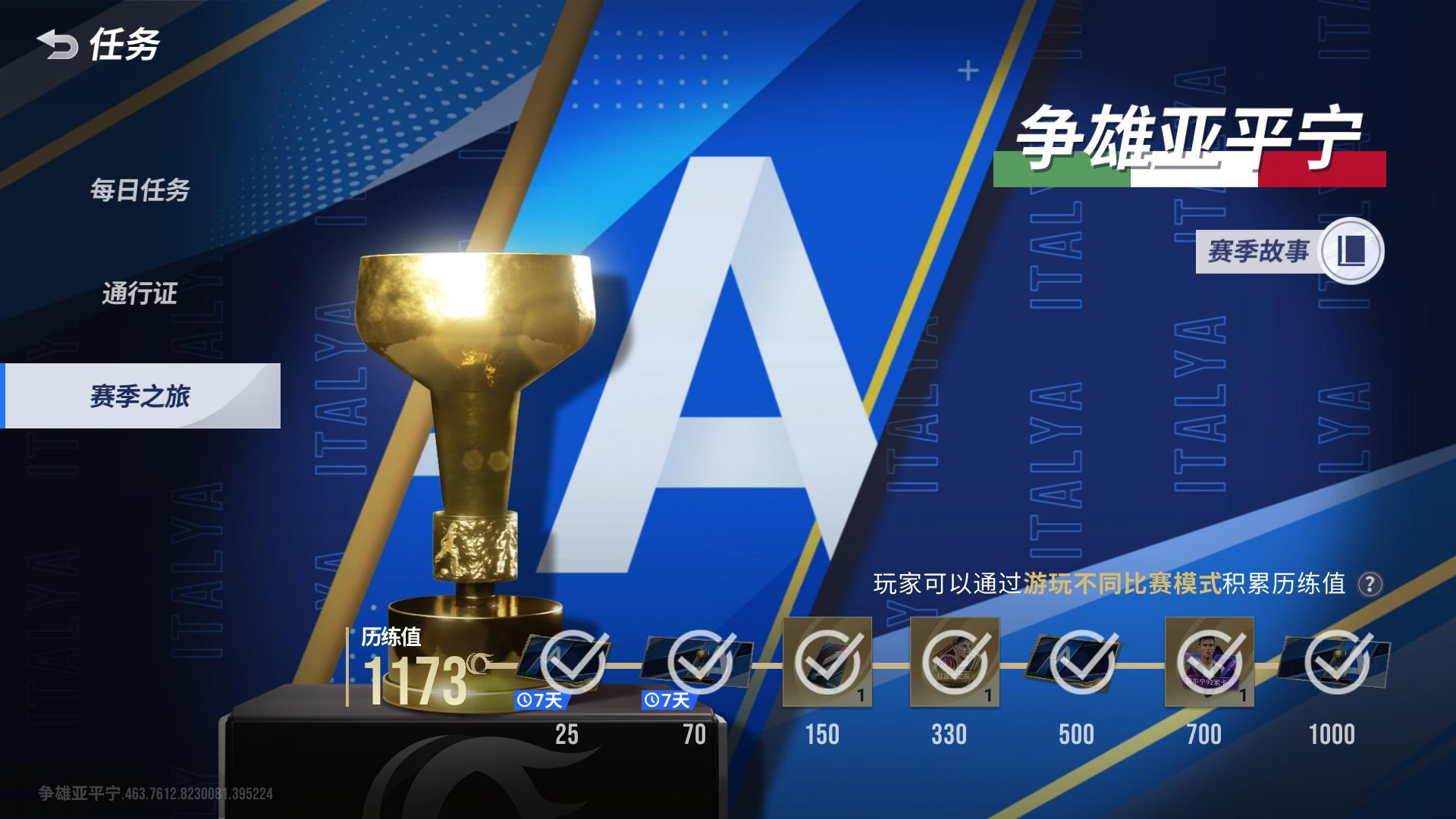 全新赛季「争雄亚平宁」来袭,经理游玩各个模式即可累计赛季历练,历练值达成之后玩家可前往【任务-赛季之旅】领取赛季专属主题、名牌、赛季时刻、换队卡、球员等奖励;同时全新赛季剧情【争雄亚平宁】开放,玩家可前往【剧情模式】体验意大利顶级联赛的相关剧情关卡。