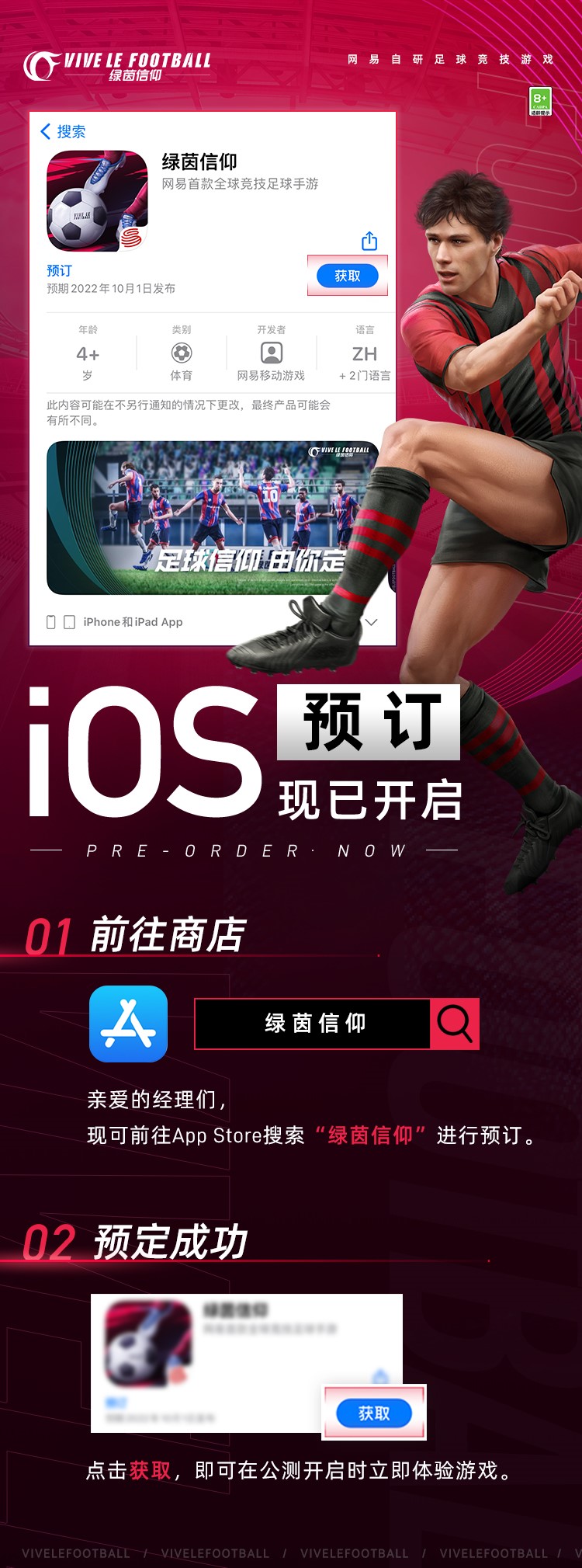 足球信仰,由你定义!作为网易首款全球竞技足球游戏,《绿茵信仰》致力于打造一个真实而热血的足球世界,凭借创新丰富的玩法、拟真操控足球游戏手感,在几次测试中广受球迷和玩家好评。今天,《绿茵信仰》正式上架App Store,现在前往搜索“绿茵信仰”,即可马上加入预订行列。预订成功后点击“获取”按钮,即可在公测开启时第一时间体验游戏。各位绿茵经理,准备好一起体验绿茵场上盘带射门,挥洒汗水的快意了吗?
