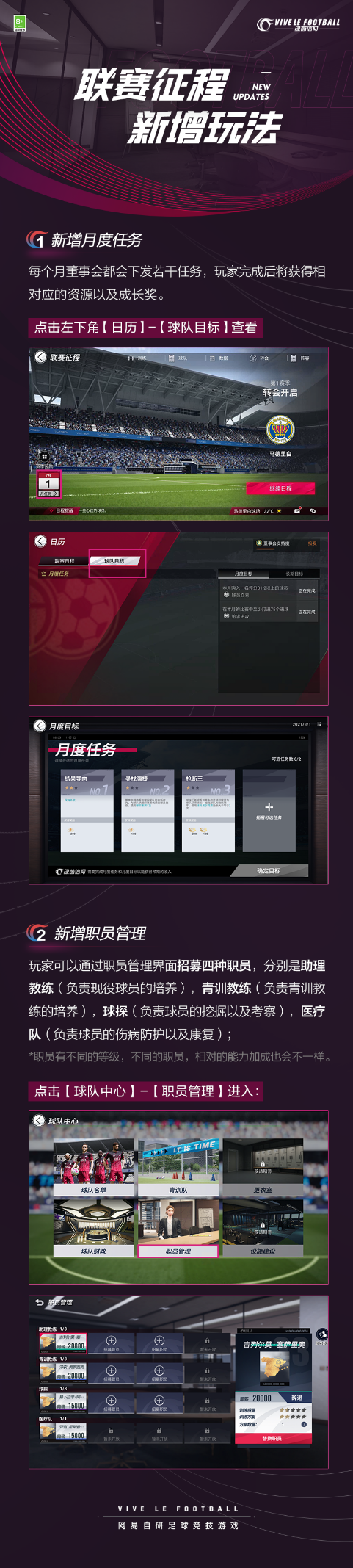 本周共研服更新,备受大家喜爱的联赛征程玩法下增加的新玩法是一大亮点。月度任务全新加入,每个月董事会将会下发若干的任务。经理们可以通过日历查看每月球队目标,以及具体的任务要求。达成董事会指定的任务目标,将能获得相对应的资源和成长奖励!