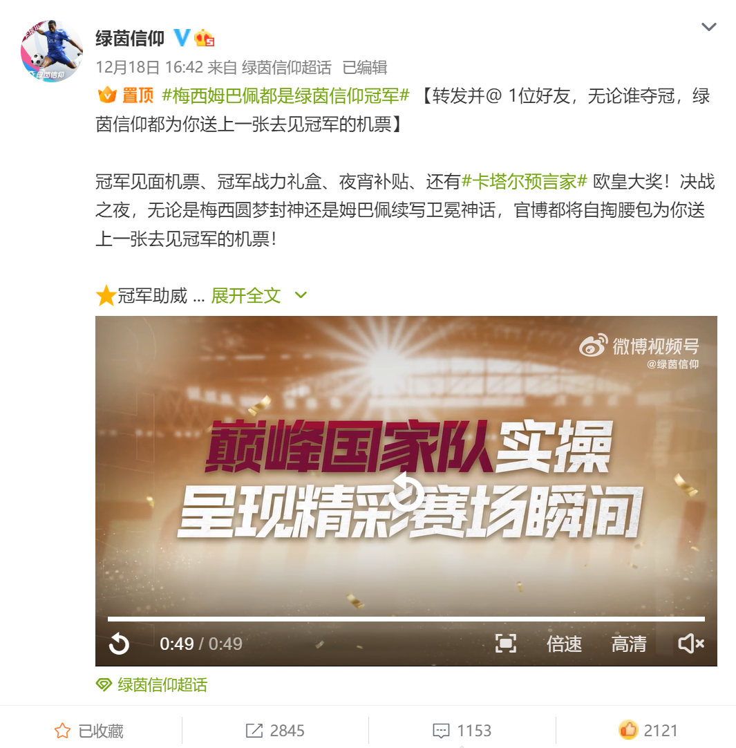 自从卡塔尔激战打响,《绿茵信仰》就在微博上与所有热爱足球的同好一起狂欢。决赛当天,微博活动再次加码,冠军见面机票、冠军战力礼盒,等众多惊喜福利让人大呼过瘾!