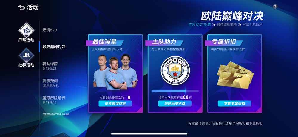 不仅如此,游戏近期还上线了【欧陆巅峰对决】活动。玩家可选择晋级欧战决赛的任一队伍,并为其中支持的某位球星加油助威。当个人支持度达标,即可解锁一定天数的限时球员礼包。全服支持度达标后,对应主队的球星专属助威礼包将会解锁一定折扣!