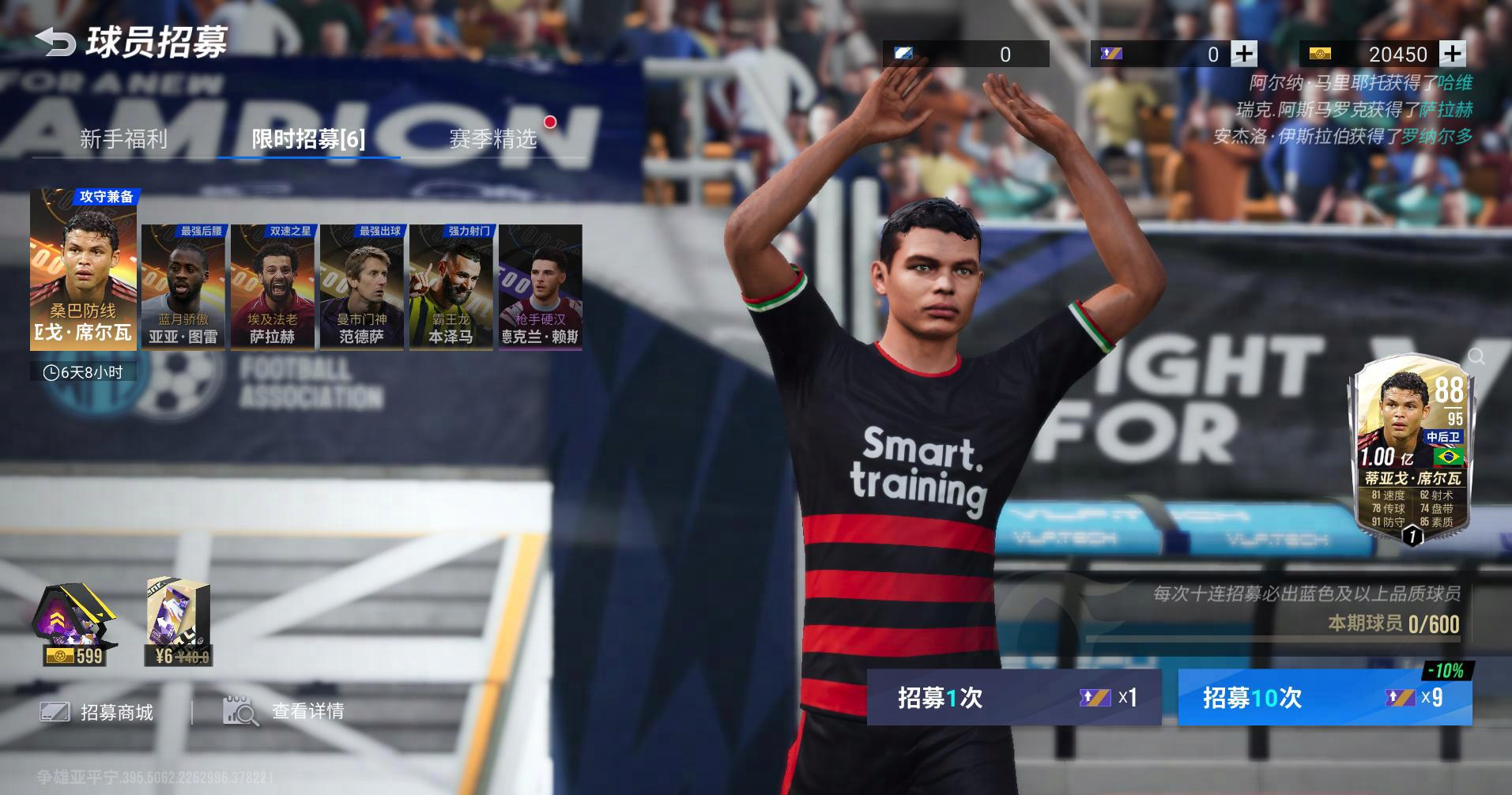 9月7日更新后-9月13日,「桑巴防线」限时卡池开启,最多 600 次限时招募必得 95 潜力中后卫蒂亚戈·席尔瓦。