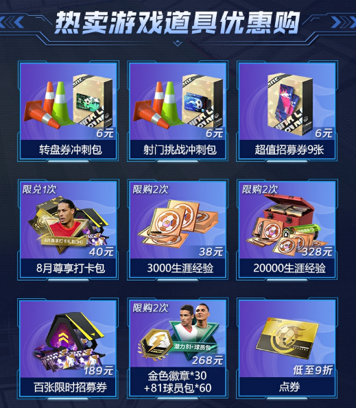 人气商品,优惠购得!《绿茵信仰》抖音官方直播间还将在当天为经理们上架诸多热门商品,优惠价格绝对让您心动!转盘券冲刺包、射门挑战冲刺包、超值招募券9张,均需6元即可购得。还有八月尊享打卡包、百张限时招募券、生涯经验等热卖道具皆以优惠价售卖,让您一次购尽兴!