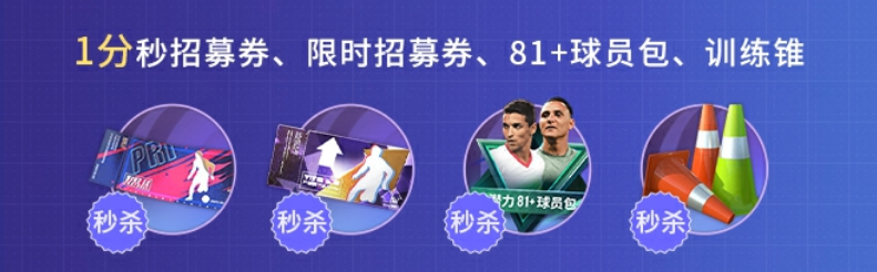 热卖商品,1分秒杀!参加1分秒杀活动,招募券、限时招募券、81+球员包、训练锥有机会只需1分钱即可带回家!机会难得,不容错过!