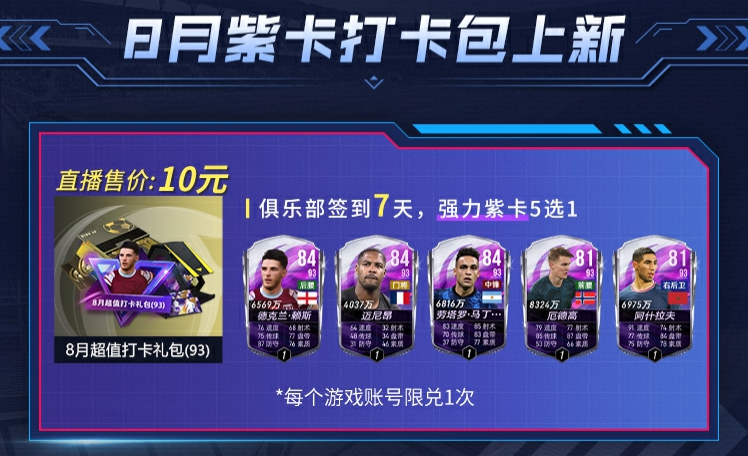 紫卡球员,低价带走!直播期间,锁定《绿茵信仰》抖音官方直播间,8月超值打卡礼包直播售价仅为10元。购买礼包的经理完成俱乐部打卡7天,即可在迈尼昂、厄德高、阿什拉夫等五位强力球员当中任远其一收入麾下,让您的球队如虎添翼!