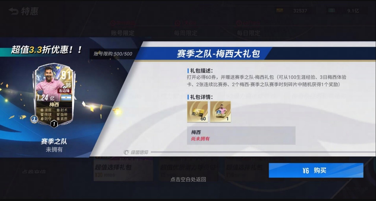 两场比赛,三个进球,一次助攻,梅西用自己无可置疑的实力在美职联再次掀起热潮。为庆祝梅西在新球队中的绝佳表现,【赛季之队-梅西大礼包】现已上架,玩家购买后必得60点券并且赠送一个【赛季之队-梅西礼包】,打开后将从梅西-赛季之队赛季时刻片段*2、梅西三日体验卡、100生涯经验、连续比赛券*2中随机获得一个奖励。