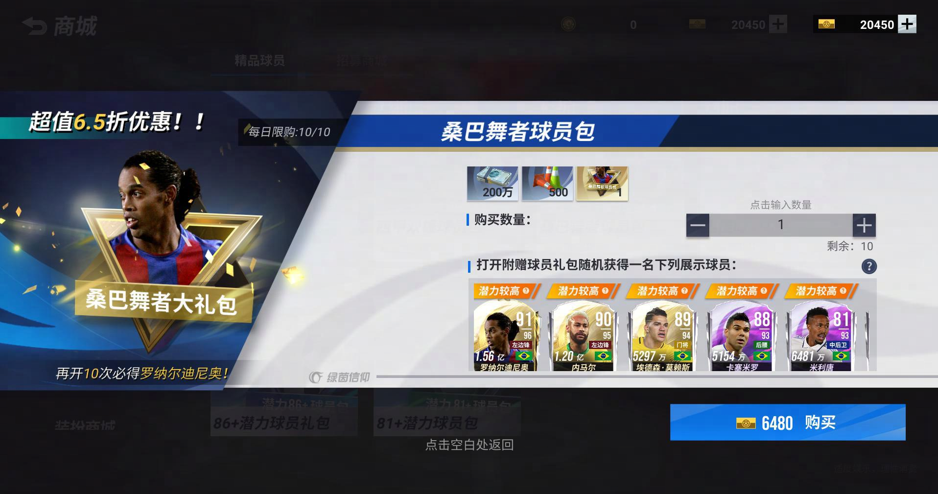 玩家购买【桑巴舞者球员包】,每开启一次都有机会获得罗纳尔迪尼奥、内马尔、埃德森、卡塞米罗、米利唐等高潜力巴西球员,同时附赠200万钞票及500训练锥!最多开启10次该礼包必得96潜力左边锋罗纳尔迪尼奥!开启5次必得金色品质球员!
