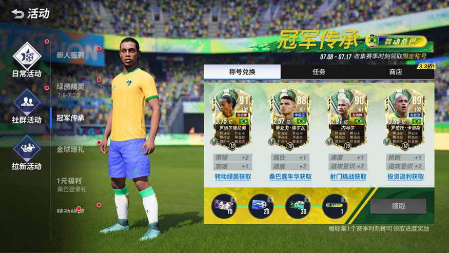 7月8日-7月17日活动期间,玩家收集齐罗纳尔迪尼奥、蒂亚戈席尔瓦、内马尔和卡洛斯的国家象征赛季时刻,即可获得限定称号“舞动桑巴”,且每收集一个赛季时刻可领取一份阶段奖励!活动期间同时开放每日任务及商店,玩家完成每日任务即可领取对应奖励,前往商店可以超高折扣购买许可证大礼包及转动卡大礼包,每日限购一次!
