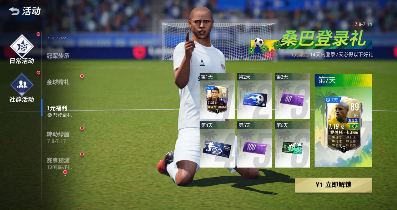 7月8日-7月14日活动期间,玩家只需1元即可激活桑巴登录礼!激活后即可直接领取【蒂亚戈·席尔瓦7日体验卡】,14天内累计登录7天,可领取完全部奖励,当期大奖为罗伯托·卡洛斯7日体验卡!