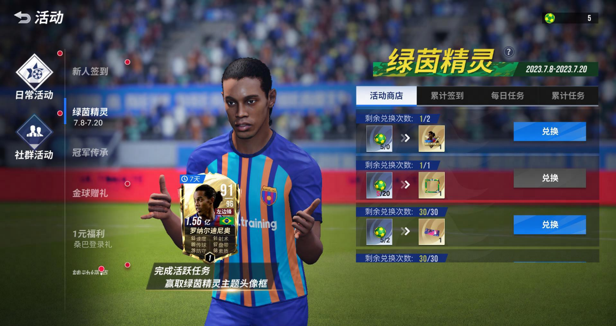 7月8日-7月20日活动期间,完成指定活动任务,即可领取“桑巴足球”。桑巴足球可用于兑换活动商店内的道具奖励。活动开放后,玩家登陆游戏即可直接领取【罗纳尔迪尼奥-7日体验卡】,后续更可凭借“桑巴足球”兑换【绿茵精灵专属头像框】、招募券、紫色徽章等大量奖励!