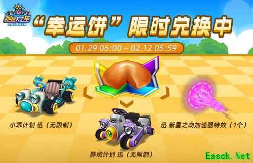 《跑跑卡丁车》在本次更新后全新改版!同时,还有“幸运饼”同步上线,打开“幸运饼”可获得包括“小乖计划 迅(无限制)”、“胖墩计划 迅(无限制)”、“迅 新星之吻加速器特效(1个)”等在内的丰富道具。