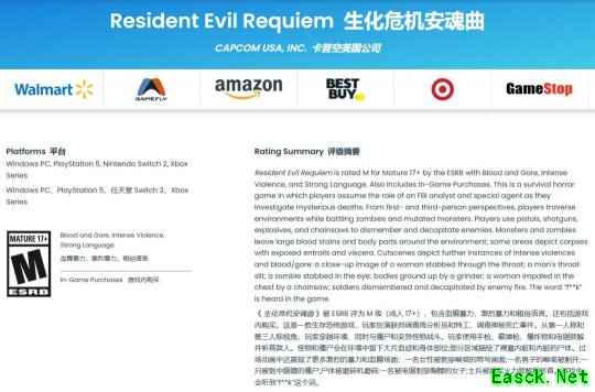 卡普空旗下备受期待的恐怖游戏新作《生化危机:安魂曲》在发售前一个月正式获得了娱乐软件分级委员会(ESRB)的评级。