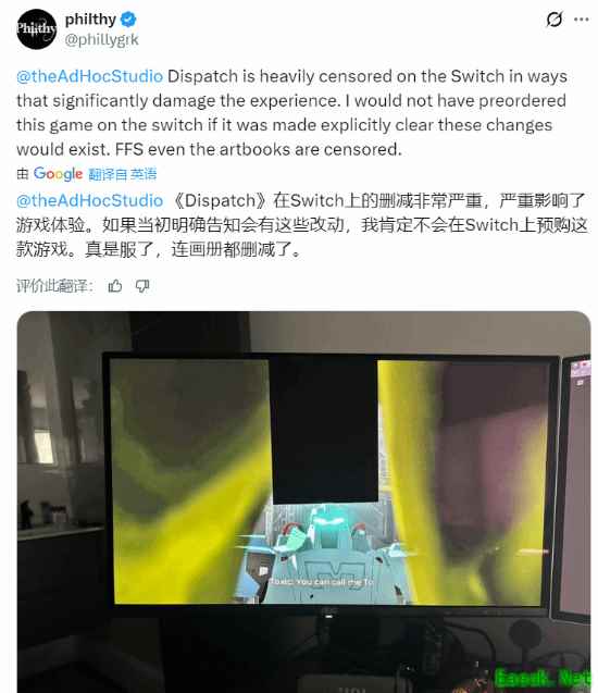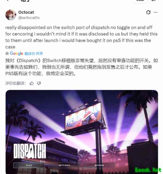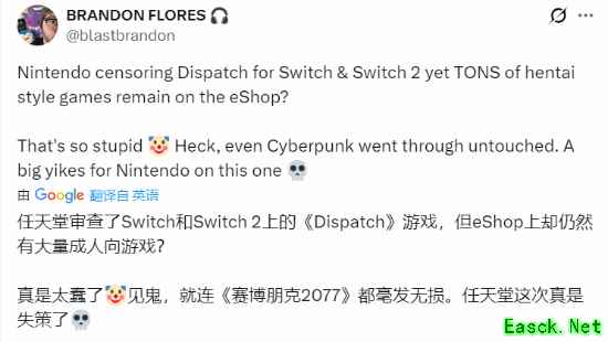 还有玩家指出其中的讽刺之处:任天堂eShop上明明充斥着大量成人向作品,就连充满暴力、脏话和裸露内容的《赛博朋克 2077》在Switch上都几乎未受影响,而《超英派遣中心》却被严格审查。