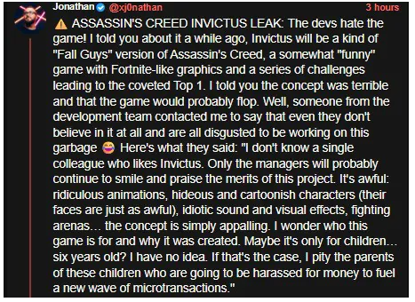 在系列15周年之际公布的《刺客信条:Invictus》,是一款被业内人士描述为类似《糖豆人》的衍生多人游戏。然而,这款游戏不仅在玩家中反响平平,更被曝在育碧内部也缺乏支持,多数开发者对其发展方向感到不满,甚至有成员表示对该项目“感到恶心”。