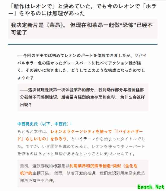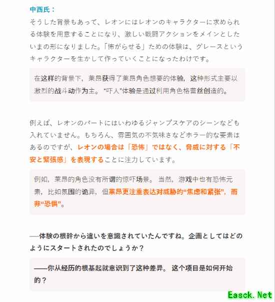 在接受日本媒体DenNicoFamiGamer采访时,中西总监被媒体问到为什么格蕾丝线和里昂线的风格差异如此显著,里昂有着大量张力极大的打斗而格蕾丝则没有。对此他回应道:开发者在《生化危机9:安魂曲》的时候,发现在用里昂做一个恐惧游戏的角色有些不太合理,因为在过去生化危机系列的故事经历之后,里昂明显更为成熟,成为了一名久经生死并且战斗经验丰富的特工,再让他在游戏中受到惊吓实在有些困难也不合理。