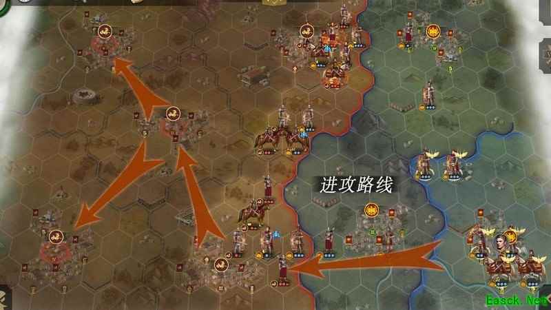 本关需占领三个战略要地,歼灭四十支敌军及四支关键部队。沿指定路线推进,重点目标位于中央红圈城市上下两侧,各有两个。攻占城池补充兵力,注意累计击杀敌军数量。