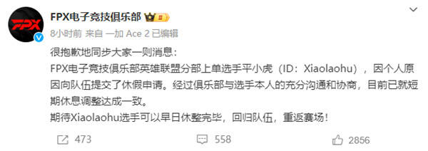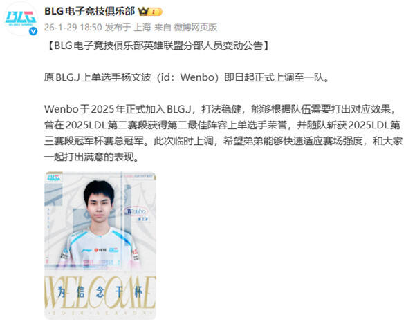 紧接着,BLG 官方火速发布人员变动公告,正式宣布二队上单 Wenbo 即日起上调至一队,特意标注 “临时上调”。没有提及 Bin 的任何情况,没有辟谣,没有说明,这份避重就轻的公告,实则默认了 Bin 出走的流言,相当于间接实锤了爆料的真实性。更有意思的是,这位紧急补位的二队新人,拼音缩写与 TES 下路喻文波(JackeyLove)完全一致,都是 YWB,网友们瞬间玩梗调侃:“哥哥又要拿下 100% 参团率了,这波是 BLG 紧急‘借名’救场?”