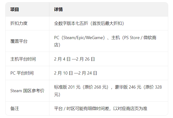 ●主机平台(PlayStation Store、微软商店):2月4日 - 2月26日