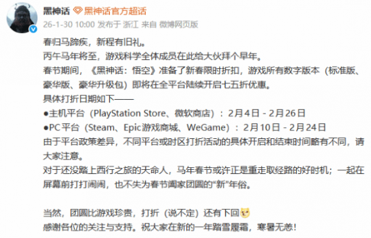 《黑神话:悟空》于 2026 年 1 月 30 日官宣新春全平台限时七五折,覆盖标准版、豪华版、豪华升级包,为发售以来新史低,PC 与主机平台分时段开启。