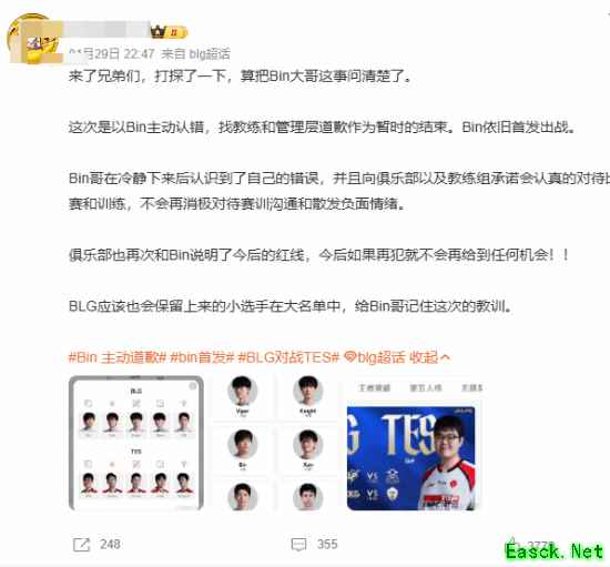 电竞博主透露,Bin已主动向教练组和管理层认错,承诺认真对待训练比赛,因此仍担任对阵TES的首发。电竞博主透露,Bin态度转变避免了“双方下不来台”的僵局,否则有可能面临更严厉的处罚。