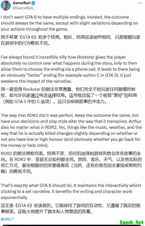 GameRoll 指出,他想要的是 Rockstar 在 《荒野大镖客 2》 中采用的那种方式。作为前传,玩家可能已经知道故事的走向,但正是这些选择让游戏过程变得引人入胜。