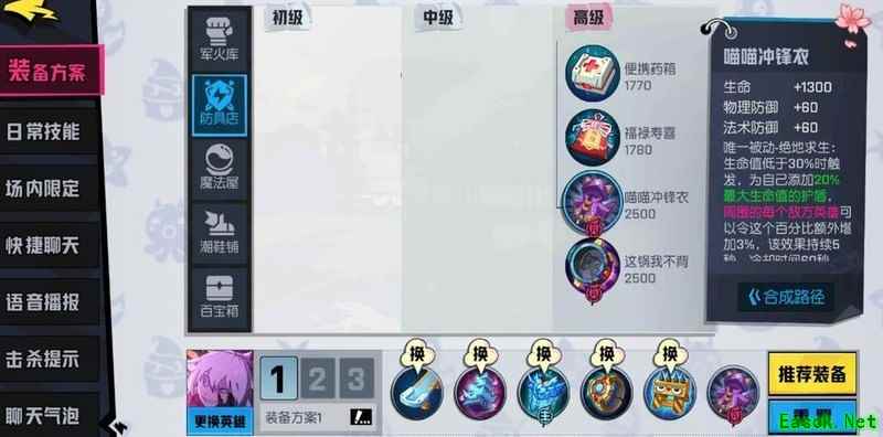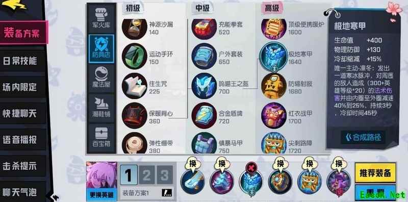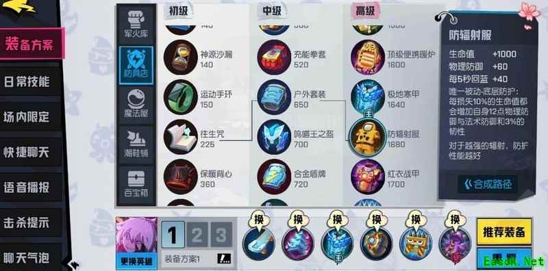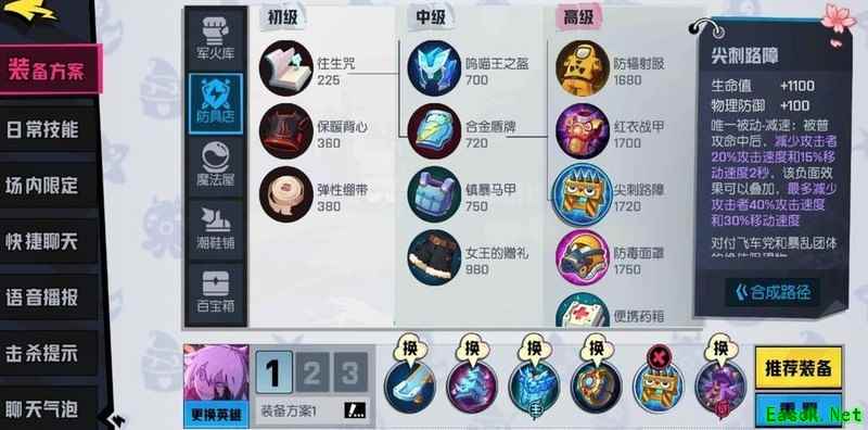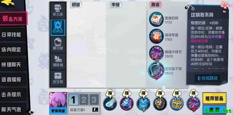前期硬甲提供的回蓝效果对琰萝有一定增益,若发育顺利可提前合成。赏金猎人可替换为玲珑塔,也可先出面包过渡,后期再完成装备合成。