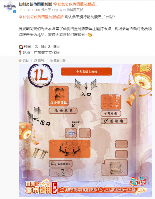 近日《仙剑奇侠传四:重制版》官方发文宣布,本作将参展漫行纪动漫展·广州站。时间:2月6日-2月8日,地点:广东数字文化谷。在漫展期间,官方为大家准备了仙剑四重制版新年主题打卡点,现场参与活动可免费领取限定周边礼品。