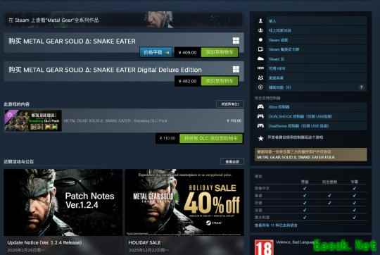 《合金装备》系列最新作品是《合金装备3:重制版》。该作于2025年8月发售,登陆了PC、PS5和Xbox SeriesX/S平台,Steam国区标准版409元。