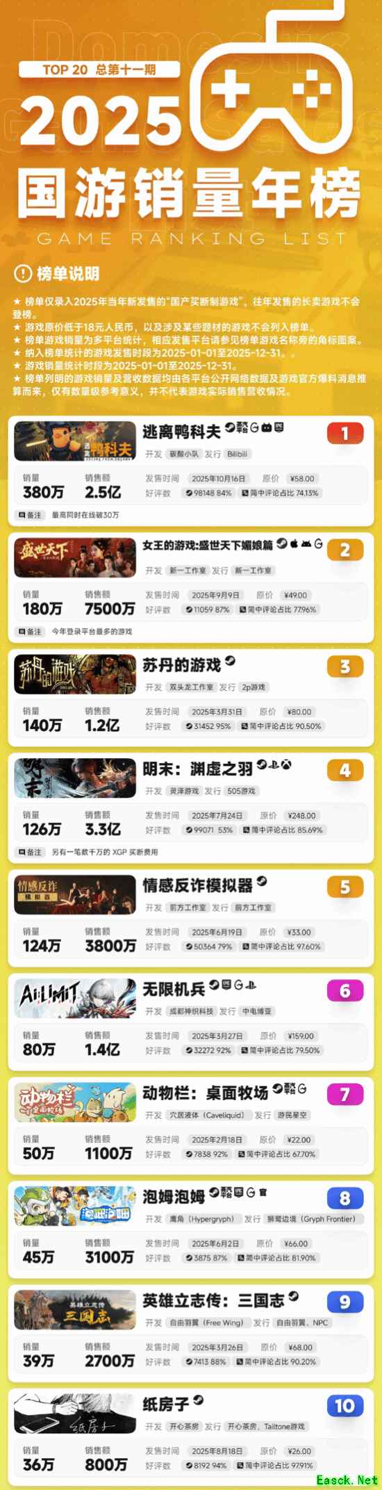 第二个依据是Steam年度最畅销新品榜。该榜单统计游戏发售前两周的收入。《明末》位于榜单白银级(第25-50名之间)。博主以同级别的游戏《逃离鸭科夫》作为参照,推算出《明末》在Steam前两周的销量大约在30-40万份之间。