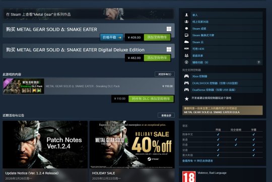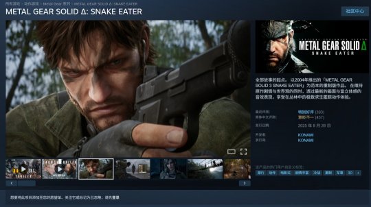 《合金装备》系列最新作品是《合金装备3:重制版》。该作于2025年8月发售,登陆了PC、PS5和Xbox SeriesX/S平台,Steam国区标准版409元。