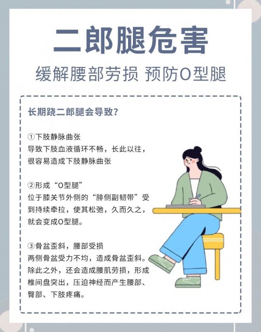 肌肉失衡加剧损伤:跷二郎腿会让腰部、臀部、腿部肌肉一侧紧张、一侧松弛,形成肌肉代偿,进一步牵拉腰椎,加速椎间盘退变,让脊柱的 “抗风险能力” 大幅下降。