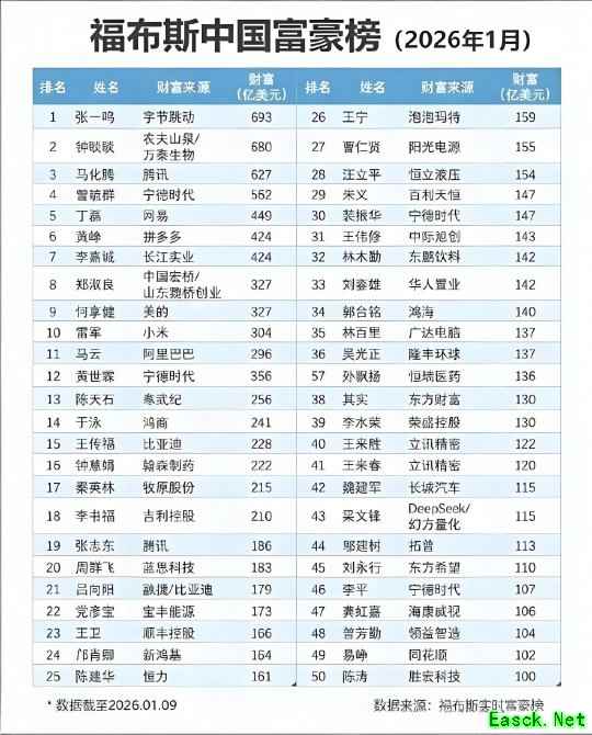 近日,福布斯中国富豪榜进行了更新(截至2026年1月份),前十名中除了稳居前三名的张一鸣、钟睒睒、马化腾外,大家熟悉的还有曾毓群、丁磊、李嘉诚等。值得一提的是,雷军也进了前十名,其拥有的财富为304亿美元,而马云排在其后面,财富为296亿美元。比亚迪的王传福(228亿美元)、顺丰王卫(166亿美元)、泡泡玛特王宁(159亿美元)、长城汽车魏建军(115亿美元)和DeepSeek梁文峰(115亿美元)分别排名第15名、23名、26名、42名和43名。