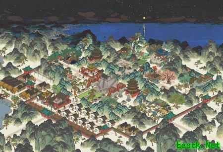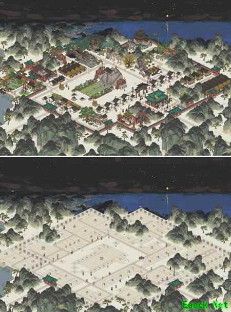 仙宫之下为桃花仙居所,此地由去年盛开的桃林与孤亭构成;其下群山环抱处是观星台,台下即太平花市,空隙间点缀着苍翠松树。
