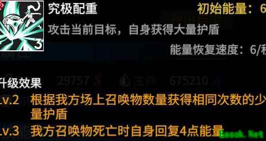攻击敌人造成伤害并生成护盾,护盾量随己方召唤物数量增加;召唤物死亡时,恢复少量能量。