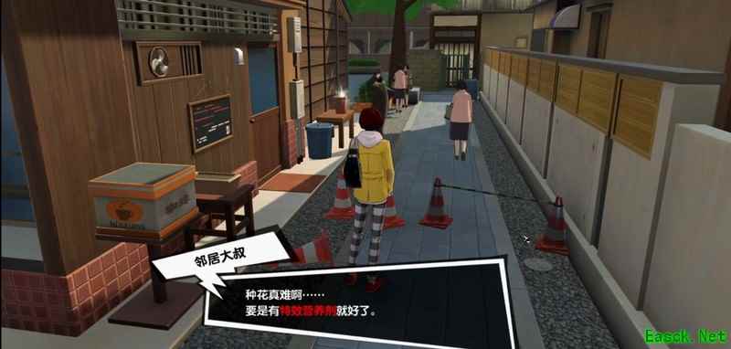 咖啡店旁,一位大叔对着花盆发呆,满脸愁容。他似乎没仔细看过种植指南,不知去哪买营养剂,一直无法开始种植。这时我们只需按提示操作,一个滑铲到花店,轻松获得特效营养剂送给他,就能解锁第5个猫猫宝藏。