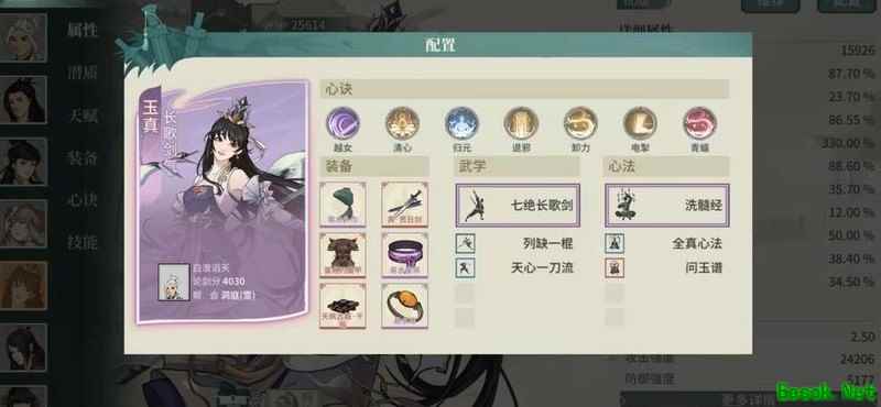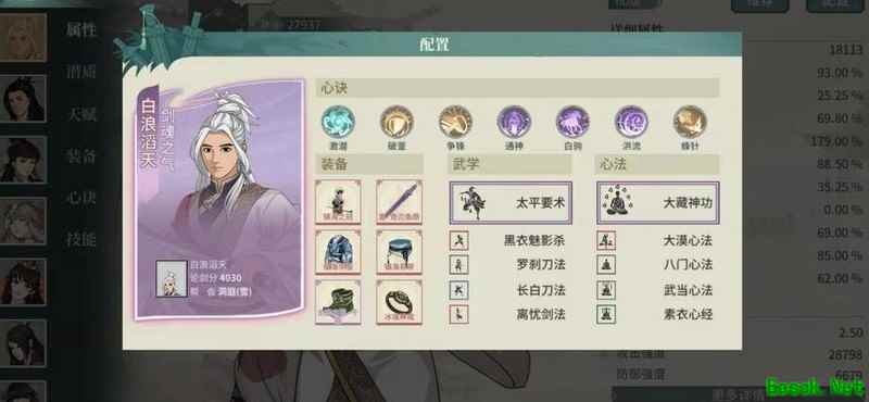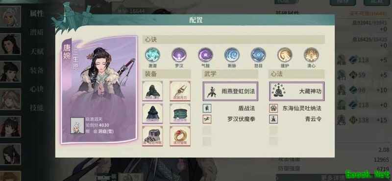 根据配装图示,戒指选择系带并双洗定力属性,武器主洗攻击、命中、暴击伤害及必暴效果,其余装备则优先洗练技能伤害、生命值、防御力,受反弹伤害尽量接近100%,同时降低受暴击伤害。主角定位为兼具输出与控制的核心角色,通常一场战斗中其控制时长超过多数侠客,且常能多次释放黄天技能,输出能力强劲。配合装备与大藏经达成满额减伤,生存能力极强,整体表现全面而稳定,攻守兼备。